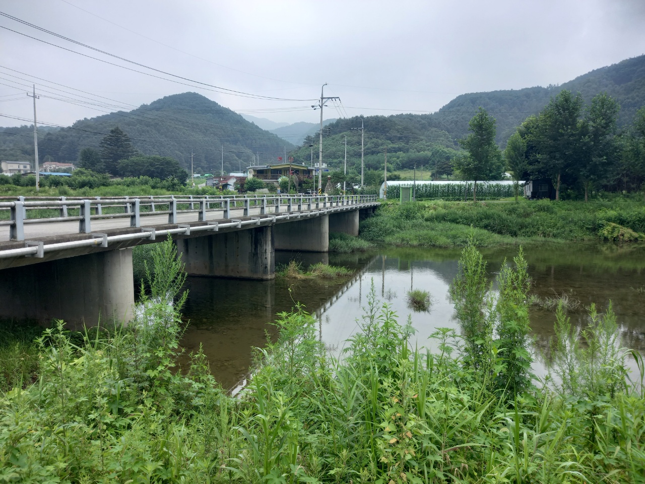 ‘산책’이라는 말은 생각만 해도 마음이 설렌다. 가족과 함께여서 좋다. 강아지와 함께 라면 더 그렇다. 아주 단순한 길이어도 좋고 짧은 길이어도 좋다. 양평에서 횡성으로 가자면 용두교차로에서 우측으로 가야한다. 가는 길에 용두교가 있다. 주변에 주차하고 용두교를 건넜다. 건너자마자 소나무펜션이 있다. 물놀이미끄럼틀도 있는 잘 꾸며진 펜션같다. 가운데길로 가면서 마을의 모습을 관찰한다. 갈래길에서 다시 왼쪽으로 갔다.비가 많이 오는 장마철이라 논의 물꼬는 터서 물소리가 졸졸 시원하게 들린다. 작은 물길에 우리 개가 들어가 물도 마시고 다리도 시원하게 더위를 식혔다. 비닐하우스에 수박넝쿨이 무성하다. 수박 몇 개가 하우스 밖으로 자라서 크고 있다. ‘수박이 넝쿨채 들어온다.’는 말대로인가. 파랗게 자라는 논..